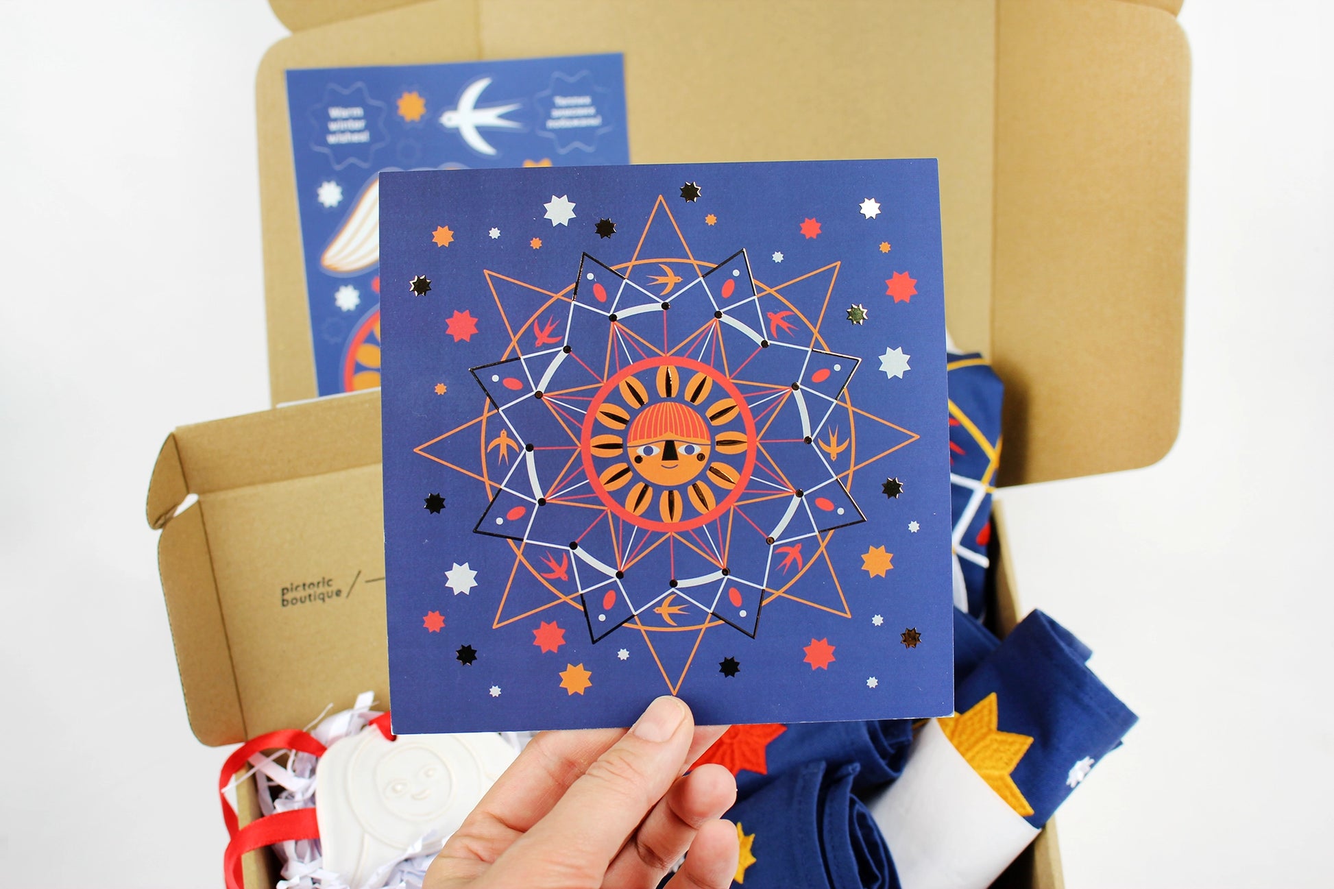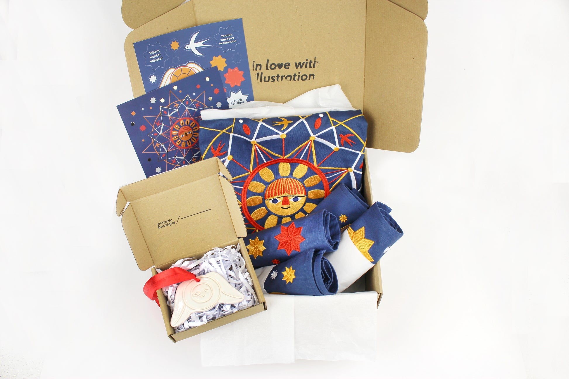 Невелика коробка, у якій зібрано найважливіше — доріжка на стіл і набір із чотирьох серветок із вишивкою, що приносять у дім тепло, світло й спокійну красу зимового вечора.