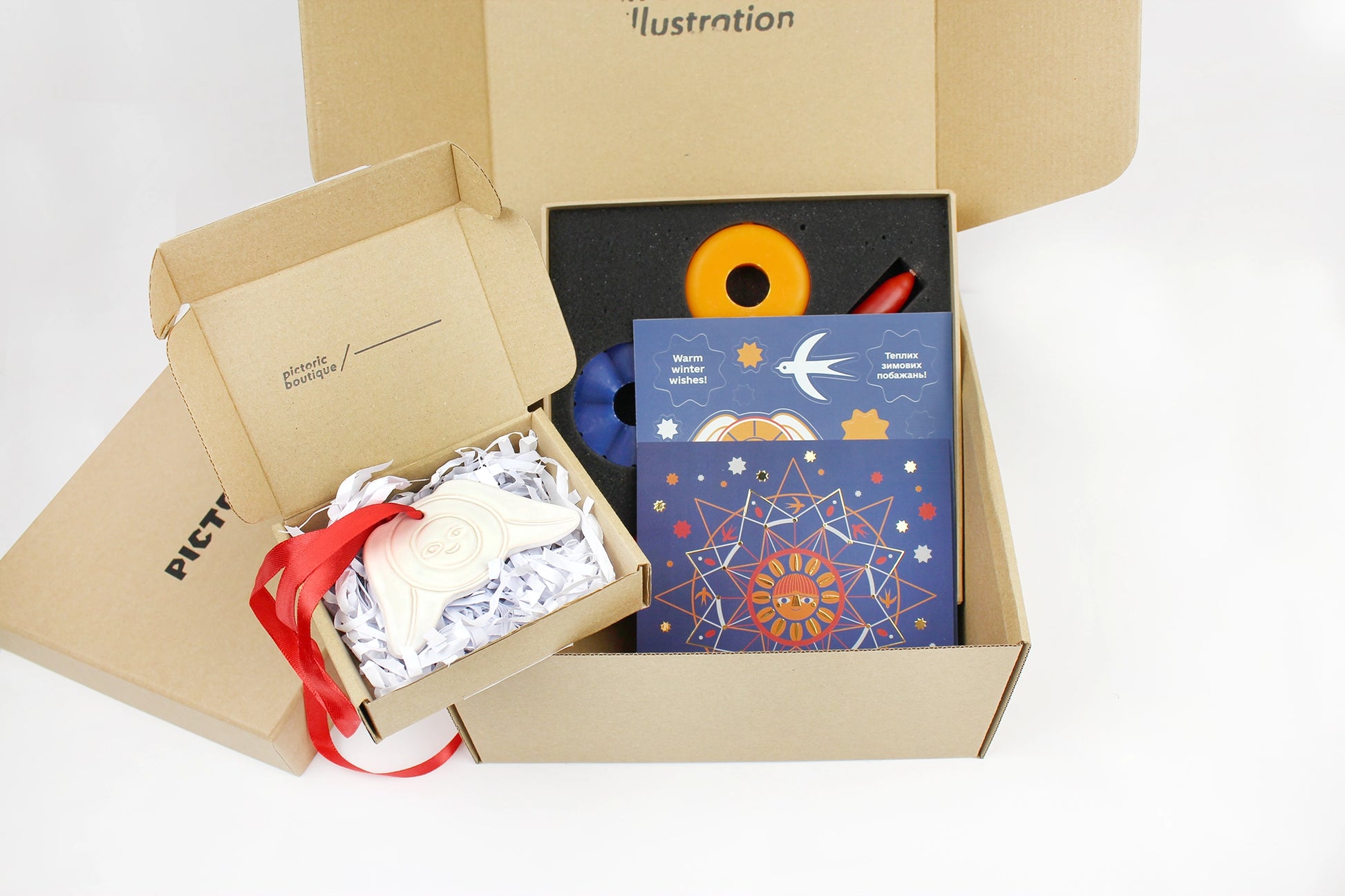 Подарунковий бокс Сяйво — це маленький набір тепла і затишку для дому. Усередині ви знайдете свічку ручної роботи, керамічну ялинкову іграшку, авторську листівку та наліпки. Кожен елемент створений, щоб наповнити простір святковим настроєм і нагадати: справжня магія починається з простого.